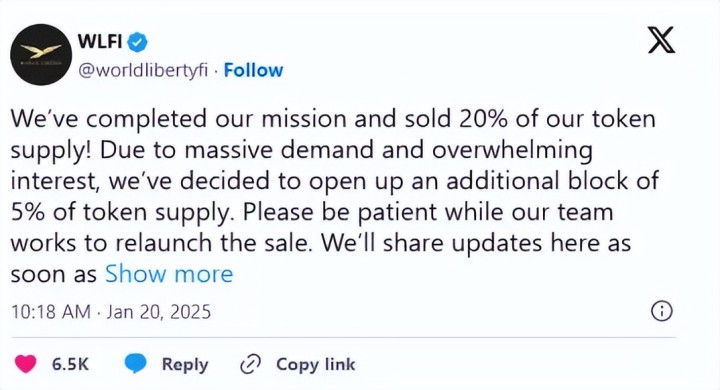 WLFI 治理代币进行了迄今规模较大的预售之一:共售出 250 亿枚代币,融资 5.5 亿美元;参与者超过 8.5 万名,显示出强劲的零售与机构需求。