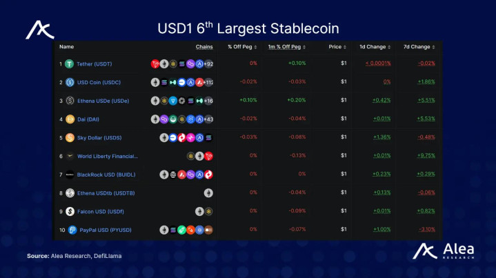 它的旗舰产品 USD1 是一种法币储备支持的稳定币。USD1 被定位为“全额抵押”的稳定币,储备为现金与美国国库券。WLFI 称其在 BitGo Trust Company 托管储备,并以此按需铸造与赎回 USD1,实现稳定币与美元的直接兑换。目前 USD1 流通量约 24 亿美元,位列第六大稳定币。