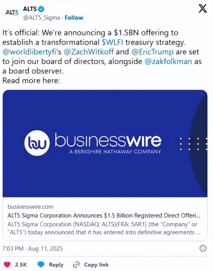 该安排类似于 MicroStrategy(MSTR)式的公司持币财库模式,表明 WLFI 试图让其代币与一家上市公司形成锚定关系。Eric Trump 加入 ALT5 董事会、Zach Witkoff 出任董事长,进一步巩固了跨公司层面的协同与关联。