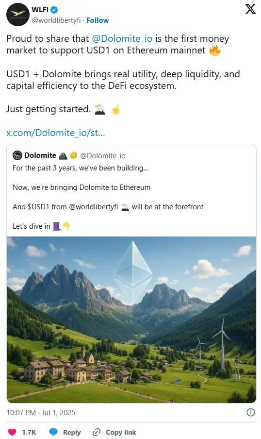 Dolomite:Dolomite 是一款借贷协议,其创始人同时担任 WLFI 的 CTO。Dolomite 较早支持 USD1 的集成,并上线相应的借贷池。