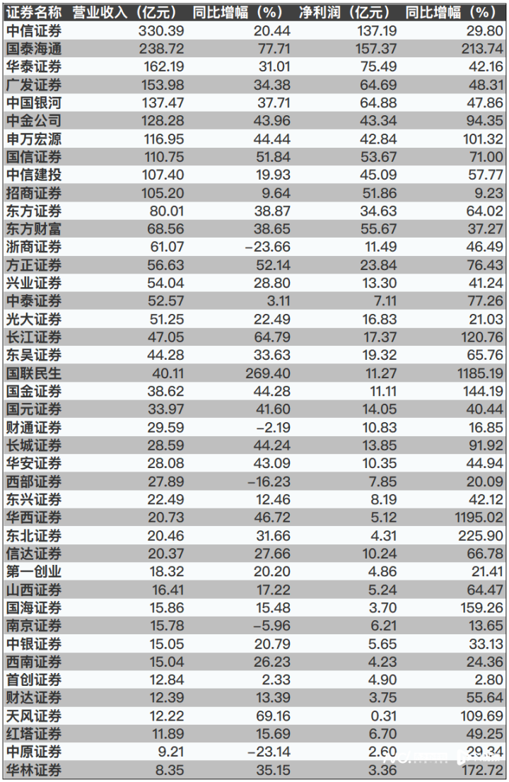 增幅方面,仅浙商证券、财通证券、西部证券、南京证券和中原证券5家券商出现营收下滑,其余37家券商均实现营收上涨,其中28家的营收涨幅超20%。国联民生的营业收入同比增速最高,大增269.4%,达40.11亿元。